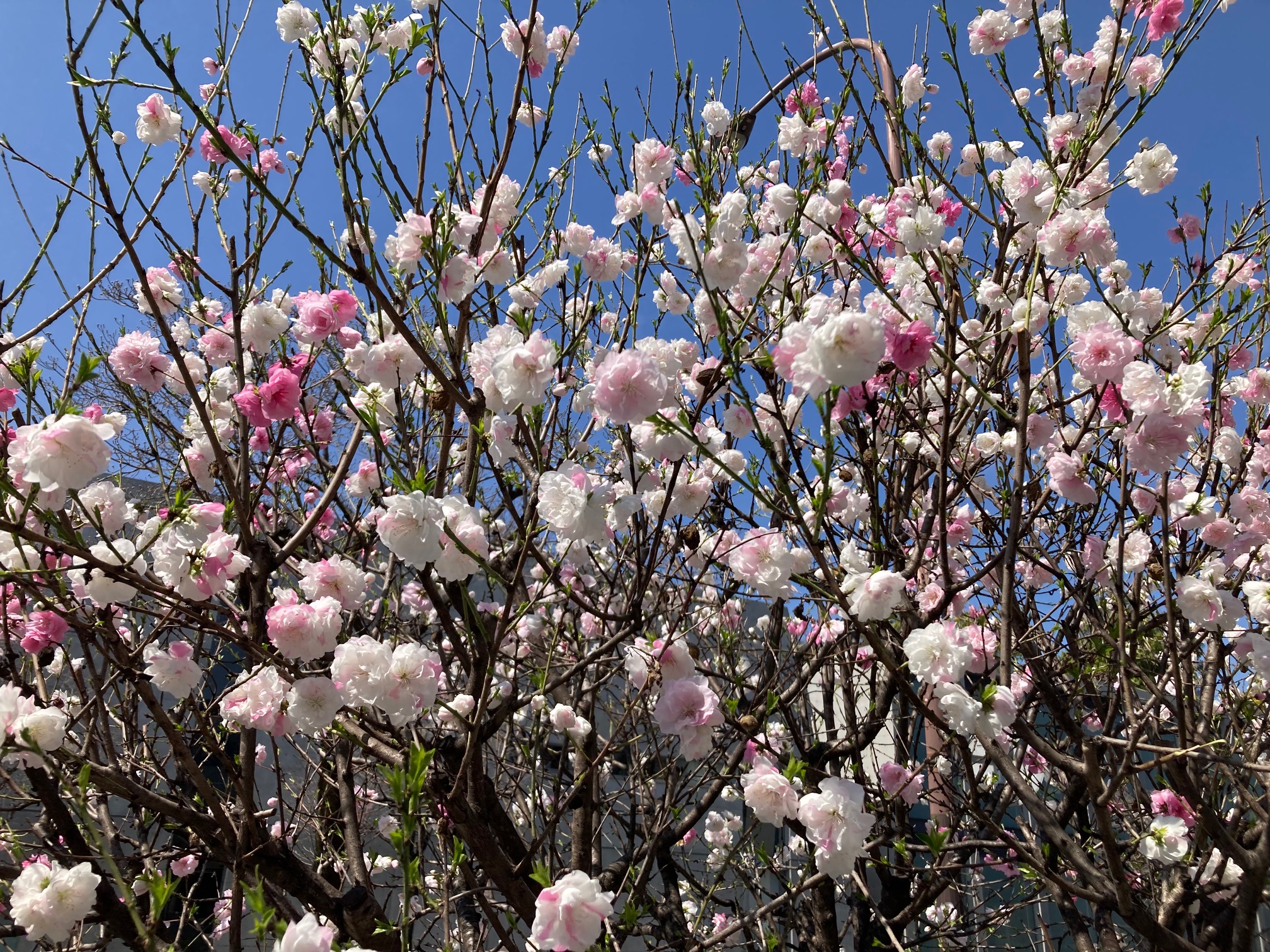 桃色と白の混じった桜にも、もう若葉が目立ち始めています。